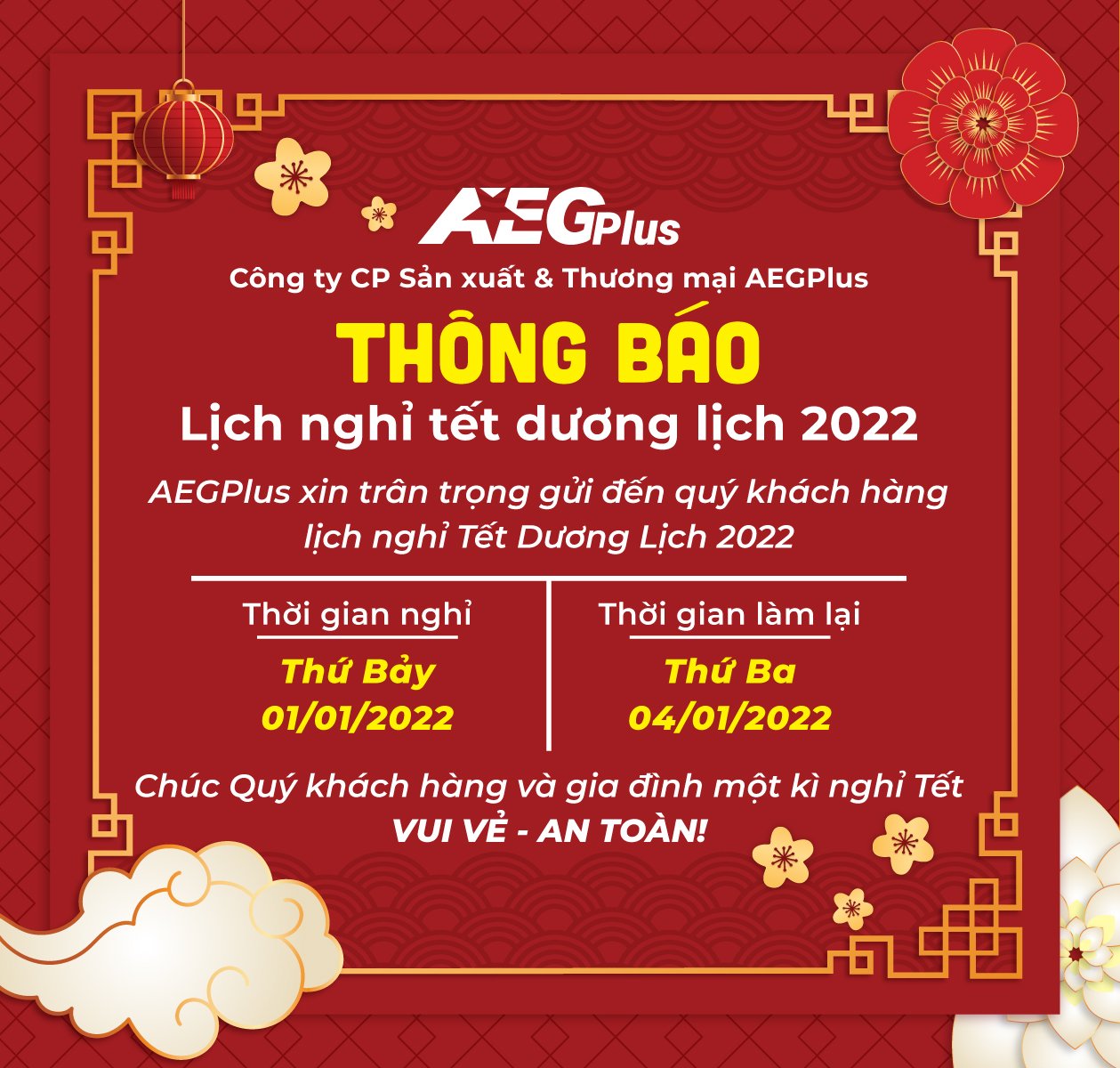 AEGPlus xin trân trọng thông báo lịch nghỉ Tết Dương lịch năm 2022 của Công Ty tới Quý khách như sau: